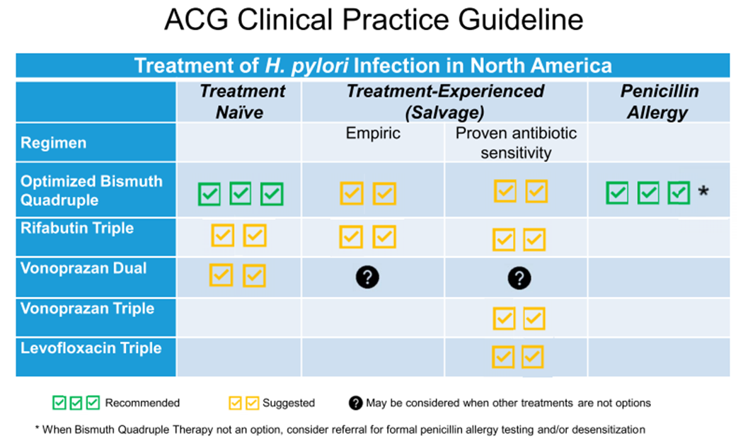 Helicobacter pylori (H. pylori) is a widespread bacterial pathogen with markedly variable prevalence across geographic regions and cohorts. The 2017 ACG guidelines on the treatment of H. pylori note an association between infection rates and socioeconomic status as well as a higher North American prevalence among African Americans, Hispanic Americans, Native Americans, Alaska natives, those living close to the U.S./Mexico border, and among immigrants from East Asia. Given the causal linkage between H. pylori and peptic ulcer disease as well as its classification by the World Health Organization as a carcinogen, the ACG recommends H. pylori testing in patients with peptic ulcer disease, mucosa-associated lymphoid tissue (MALT) lymphoma, early gastric cancer and dyspepsia. The ACG similarly makes a strong recommendation to treat all patients who test positive for H. pylori, regardless of the initial indication for testing. Several treatment regimens exist and are typically comprised of 2 to 3 antibiotics along with a PPI for a duration of 3 to 14 days. When testing to confirm eradication, the ACG recommends non-invasive testing at least 4 weeks after therapy completion. Given the known risks of untreated H. pylori infection and strong literature base to support eradication, it is assumed that H. pylori testing and treatment for positive results (referred to as “H. pylori testing/treatment”) will be performed when appropriate, even if not specifically included in the guideline below. Given the widespread availability of non-invasive testing such as the urea-breath test and stool antigens, confirmation of H. pylori eradication is not considered an independent indication for upper endoscopy.
